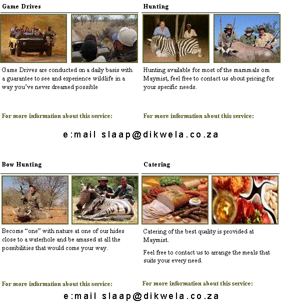 Maymist Safaris offers a child care service, where babysitters will attend to your children during meals and game drives, etc. Please notify your camp manager should you require the above-mentioned service. The standard fee for babysitting is R30 per child an hour.